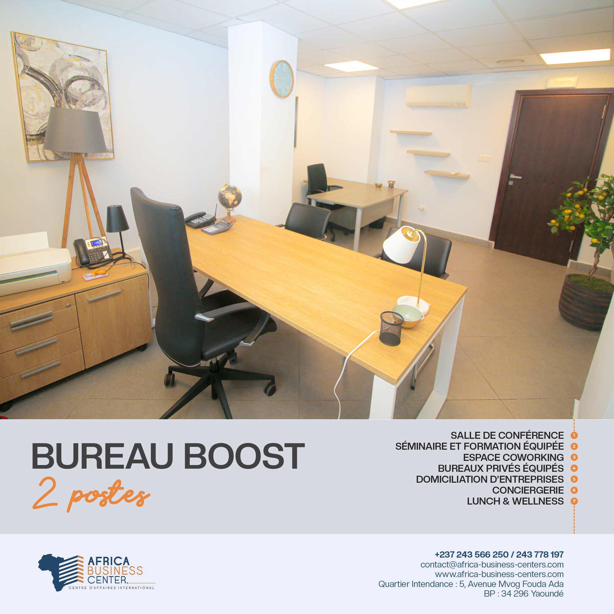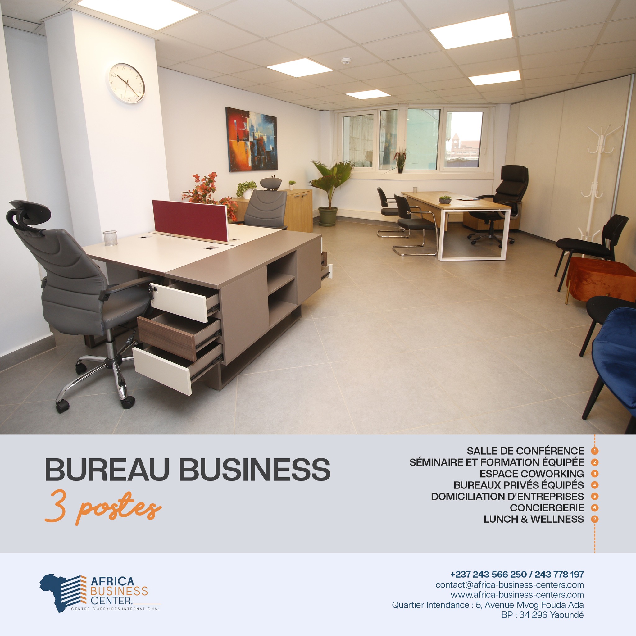 Situé à Yaoundé, sur l'Avenue Mvog Fouda Ada, Africa Business Center (ABC) est un centre d'affaires de haut standing proposant des espaces de travail équipés à louer à l'heure, à la journée ou au mois . ABC a pour vocation de promouvoir l'innovation entrepreneuriale et l'excellence africaine .