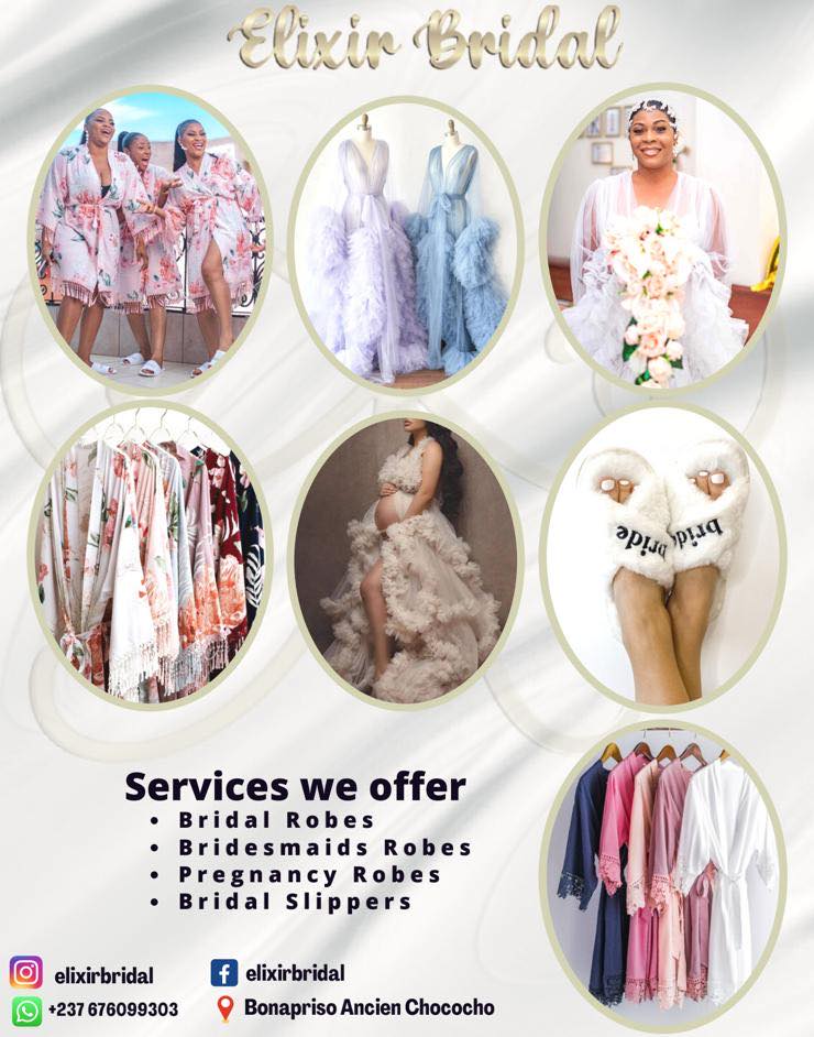 Située à Bonamoussadi à Douala, Elixir Bridal est une boutique spécialisée dans la vente de bijoux de tête de mariée et d'accessoires exquis. La boutique possède une salle climatisée où sont exposés les produits vendus, offrant ainsi un cadre confortable pour les clientes qui souhaitent trouver l'article parfait pour leur grand jour. Les services proposés incluent la commande en ligne via WhatsApp, la livraison à domicile et l'expédition vers d'autres villes du pays, rendant l'accès aux produits simple et pratique.