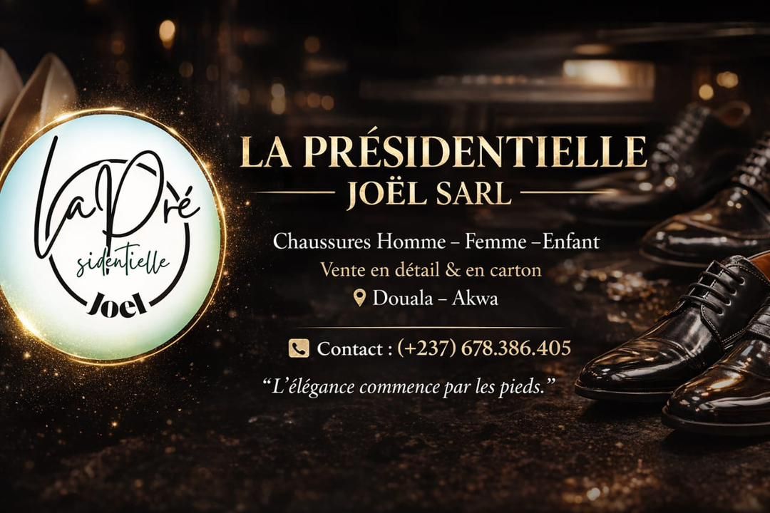 Situé à Akwa, à Douala, Présidentielle Joël Sarl est une boutique qui accueille les clients dans une salle d’exposition où les chaussures et babaouches sont présentées clairement, pour permettre un choix rapide et sûr. La boutique propose des modèles pour hommes, femmes et enfants. Chaque collection met l’accent sur le style et la qualité, avec des options adaptées aux besoins du quotidien et aux occasions où l’on veut être bien présenté.