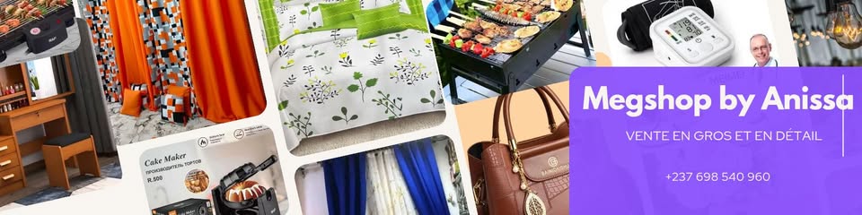 Situé au cœur de la métropole économique de Douala, Megshop by Anissa est une boutique en ligne spécialisée dans la vente en gros qui se donne pour mission de combiner la qualité, la praticité et les petits prix. L'établissement répond aux besoins des ménages et des commerçants en proposant des solutions durables pour améliorer le confort du foyer au quotidien. La sélection d'articles disponibles comprend des catégories variées :