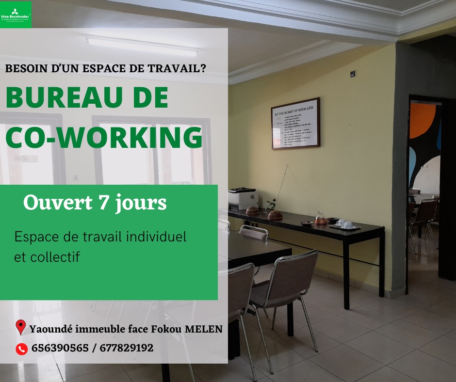 Situé à Yaoundé, à Fokou Melen, Irina Accelerator est un espace professionnel doté d'une équipe accueillante et hautement professionnelle . Ce centre propose la location de salles pour conférences, ateliers, séminaires et formations, ainsi que des bureaux privatifs. Il offre également un programme d'accélération (boost) pour les startups et les entrepreneurs.