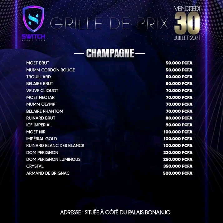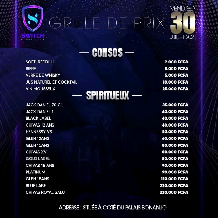 Situé à Bonanjo, dans le centre animé de Douala, Switch Night-Club est l'une des meilleures destinations nocturnes de la ville. Ce night-club moderne et dynamique est l’endroit idéal pour les fêtards et les amateurs de musique en quête de soirées électrisantes. Avec une ambiance envoûtante, Switch Night-Club propose des événements de danse, des DJ sets et des soirées thématiques, dans un cadre contemporain et élégant. Les activités phares de Switch Night-Club incluent ses soirées à thème, ses performances live, et ses événements animés par des DJ locaux et internationaux. Ce club est parfait pour les adultes, en particulier ceux qui aiment danser au rythme de la musique électronique, house, afrobeat, et autres genres populaires. Le club est conçu pour offrir une expérience immersive avec une capacité d’accueil de 300 personnes, réparties entre la piste de danse et les espaces lounge. Les tarifs varient selon les événements, avec des entrées généralement à prix abordables et des offres spéciales pour les groupes.