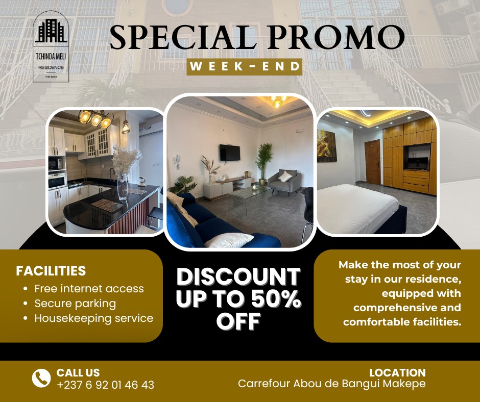 Les clients apprécient particulièrement l’élégance des lieux ainsi que l’atmosphère sereine qui y règne. Que ce soit pour les étudiants, les jeunes actifs ou ceux en déplacement professionnel, Tchinda Meli Residence propose un cadre prestigieux qui allie confort, élégance et sérénité.