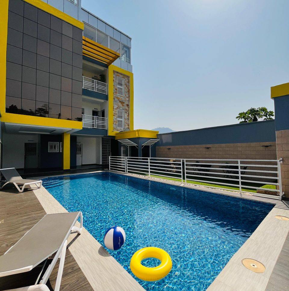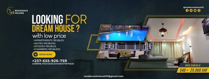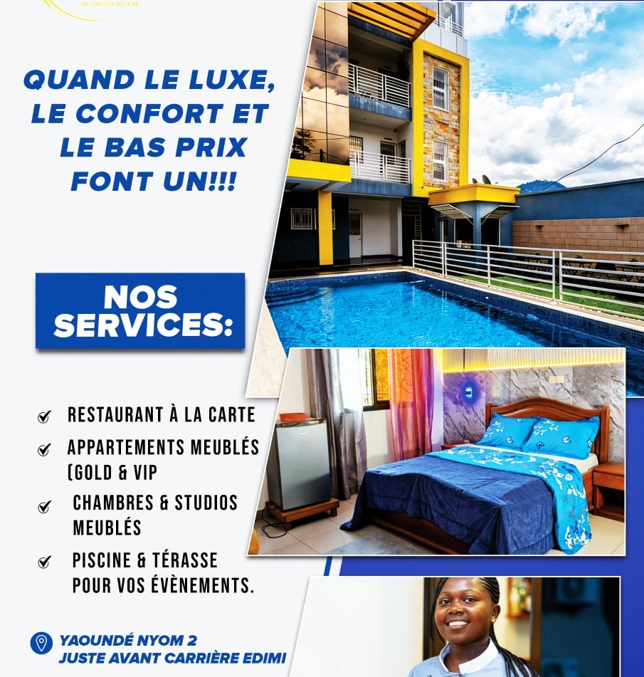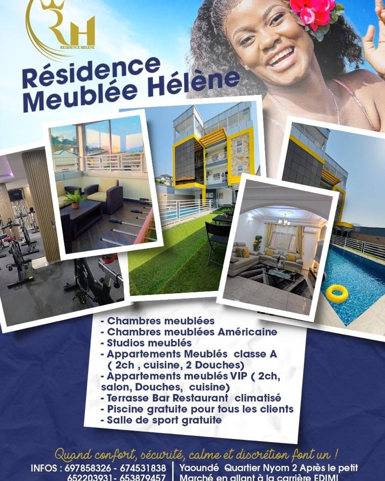 Située à Nyom, à Yaoundé, la Résidence Hôtelière Hélène est un établissement d'hébergement qui propose des appartements meublés, des chambres meublées, et des studios équipés pour un séjour des plus confortables. Les clients apprécient particulièrement les installations soignées, offrant un cadre agréable pour le repos et la détente. La résidence dispose également d'une piscine, parfaite pour se rafraîchir après une journée bien remplie, ainsi que d'un bar et d'un restaurant, où il est possible de savourer des repas et des boissons dans une atmosphère conviviale.