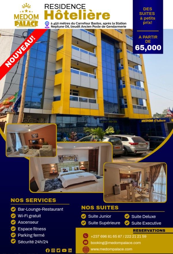 Située à Bastos, à Yaoundé, la Résidence hôtelière MEDOM Palace est un établissement d'hébergement qui offre une expérience haut de gamme avec des suites variées, allant des suites junior aux suites supérieures, en passant par des suites exécutives et des suites deluxe. Chaque logement est aménagé pour garantir confort et élégance, parfait pour les séjours d'affaires ou de loisirs. L'établissement dispose également d'un bar-lounge-restaurant, où les clients peuvent savourer une cuisine raffinée dans une atmosphère relaxante.