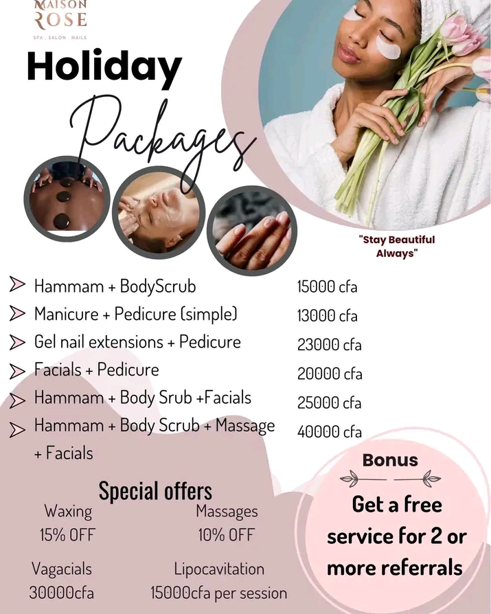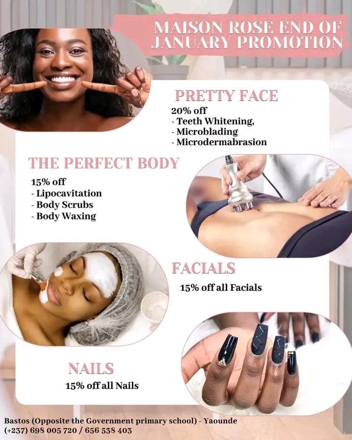 La Maison Rose est sans conteste une référence du bien-être à Yaoundé, idéale pour celles et ceux qui souhaitent allier soins d’exception et expérience sensorielle inoubliable. Pour tout renseignement ou prise de rendez-vous, l’équipe reste disponible pour vous guider dans le choix de votre moment de détente idéal.