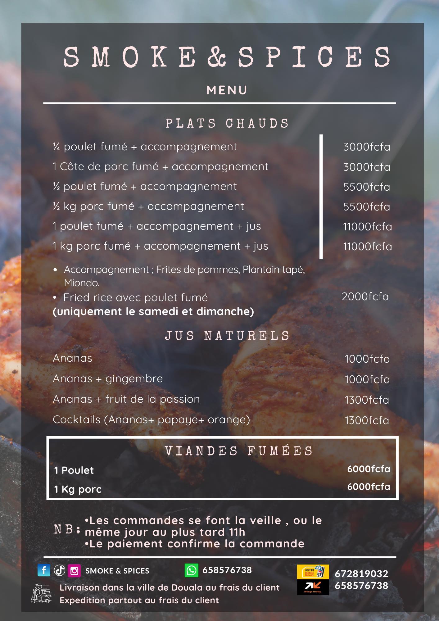 Smoke & Spices est le choix parfait pour les amateurs de viandes fumées et de saveurs audacieuses à Douala. Pour commander et planifier une livraison, contactez-les exclusivement via leurs réseaux sociaux ou par téléphone.