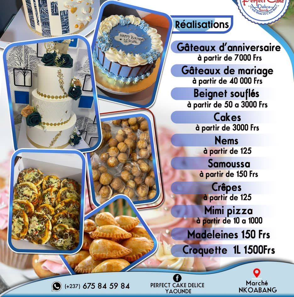 Le menu de Perfect Cake Délice Yaoundé est riche et diversifié, comprenant des cakes moelleux, des croquettes croustillantes, des crêpes délicieuses, des mini pizzas, des beignets soufflés, des muffins, ainsi que des nems et des samoussas. Les gâteaux à la crème sont également disponibles pour toutes les occasions, rendant chaque célébration encore plus spéciale.
