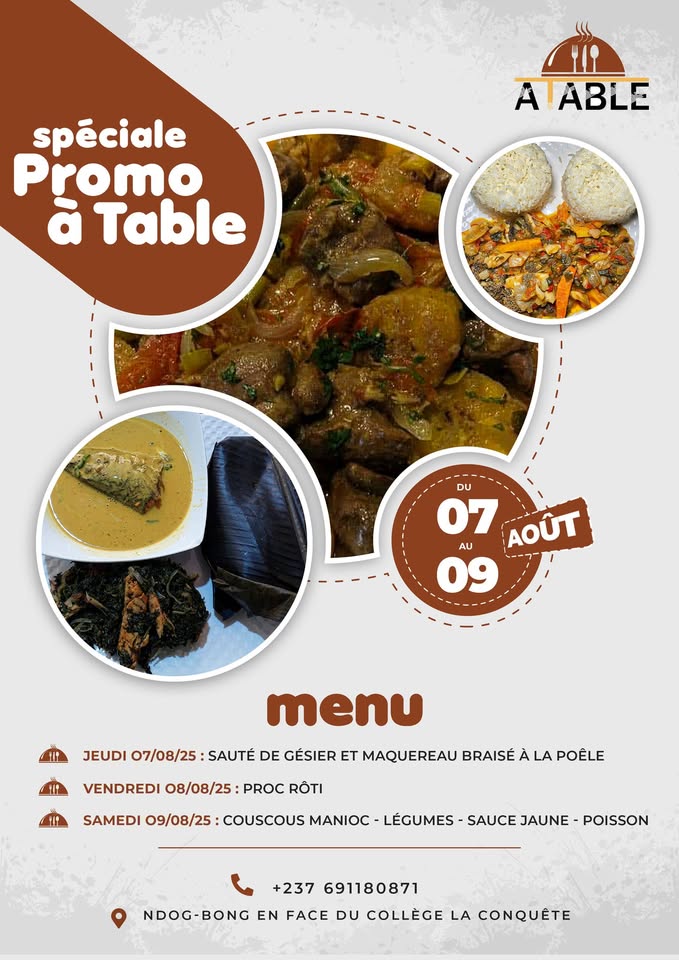 Situé à Ndogbong, à Douala, le restaurant A TABLE est un véritable haut lieu pour tous ceux qui désirent découvrir les délices de la cuisine camerounaise. Ouvert tous les jours, A TABLE propose une salle intérieure accueillante, dotée de sièges confortables, parfaite pour partager un repas en famille ou entre amis. Le menu met en avant une variété de plats savoureux, allant du eru au taro, en passant par le ndolé et les viandes braisées, le tout dans une ambiance chaleureuse et conviviale.