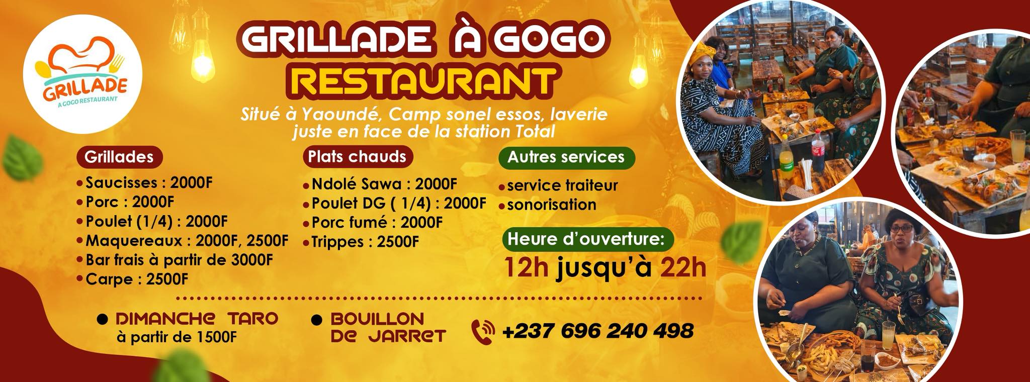 Le dimanche est un moment sacré, où les clients peuvent venir déguster le délicieux taro, servi à partir de 1500F. Grillades A Gogo ne se limite pas à la gastronomie, mais offre également des services dédiés pour les événements. Un service traiteur est disponible pour les mariages, anniversaires et réunions professionnelles, tandis qu'une option de sonorisation permet d'ajouter une ambiance festive à toutes les célébrations.