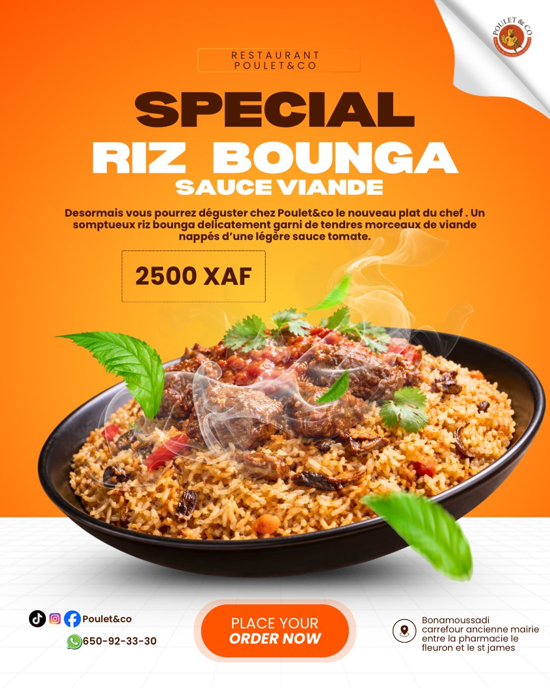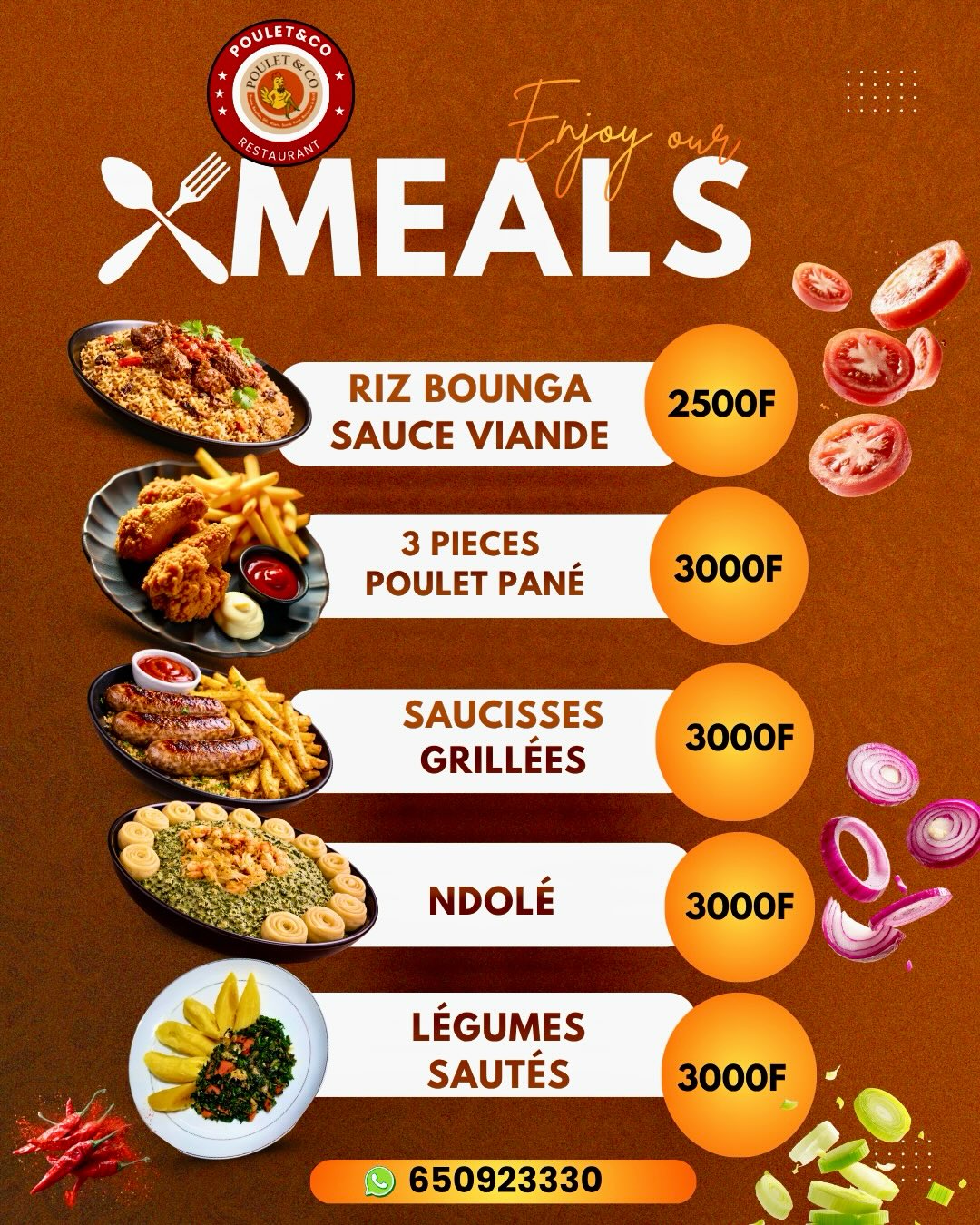 Côté saveurs, Poulet & Co se présente comme un véritable temple du poulet. Les amateurs de poulet croustillant y trouvent leur bonheur, tandis que ceux qui aiment bien manger peuvent savourer le riz mbounga sauce viande. Pour varier les plaisirs, le restaurant propose aussi le bon plan du week-end avec des brunchs, une formule appréciée pour les sorties du samedi et du dimanche.