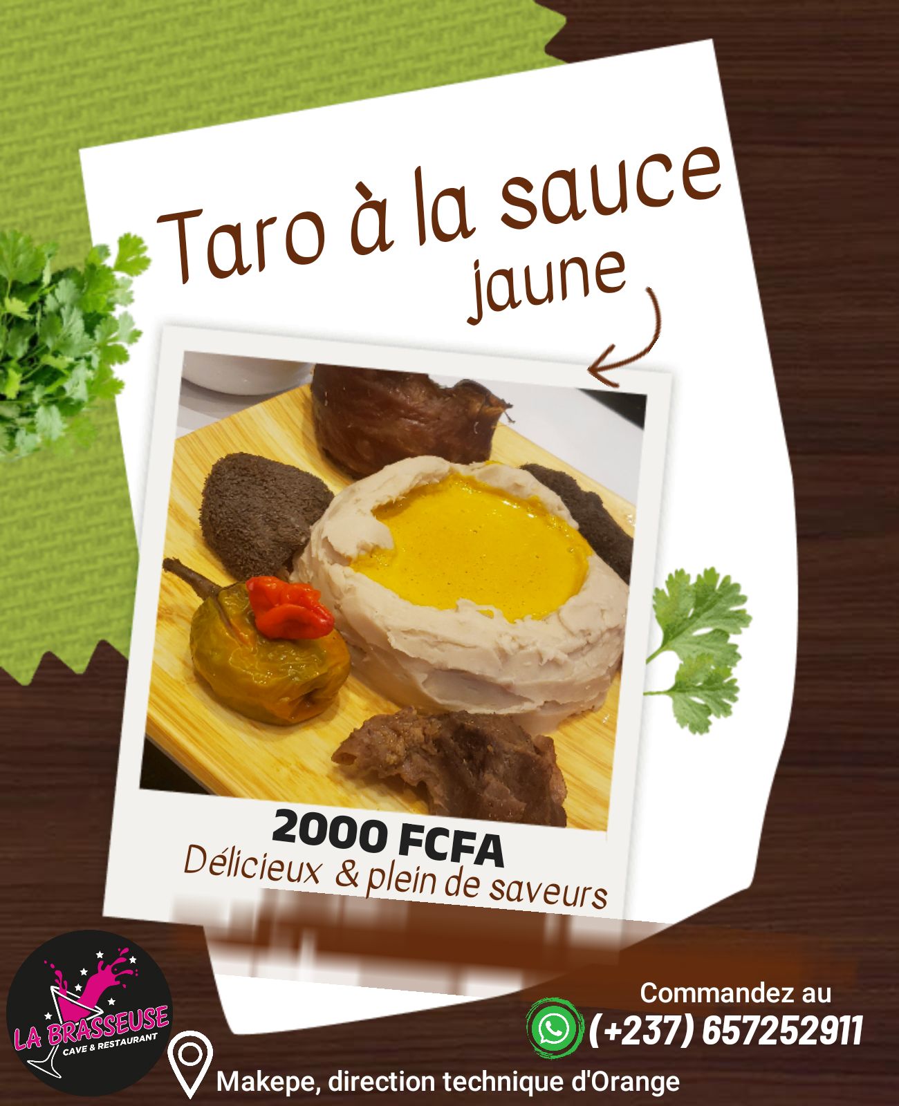 L'établissement propose des plats du terroir qui mettent l'accent sur les saveurs locales. Le Taro à la sauce jaune est particulièrement mis en avant le dimanche et fait partie des spécialités très appréciées par les habitués. En parallèle, labrasseuse.cave accueille également les amateurs de boissons, avec un espace bar et cave à boissons pour accompagner les repas ou simplement profiter d'un verre.