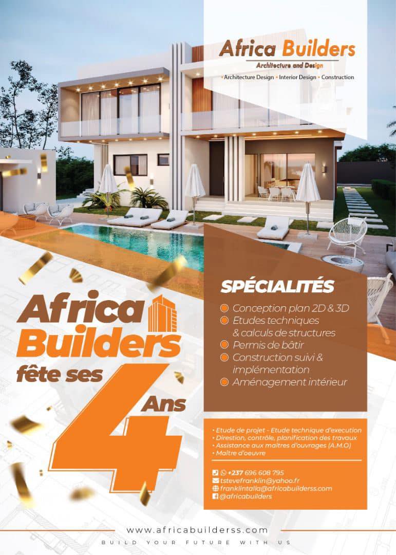 Située à Bastos à Yaoundé, Africa Builders est une entreprise spécialisée dans l'architecture et le design intérieur, offrant un concept “clé en main” pour ses clients. Avec une approche professionnelle et créative, Africa Builders s'engage à transformer les espaces de vie et de travail selon les besoins spécifiques de chaque client.