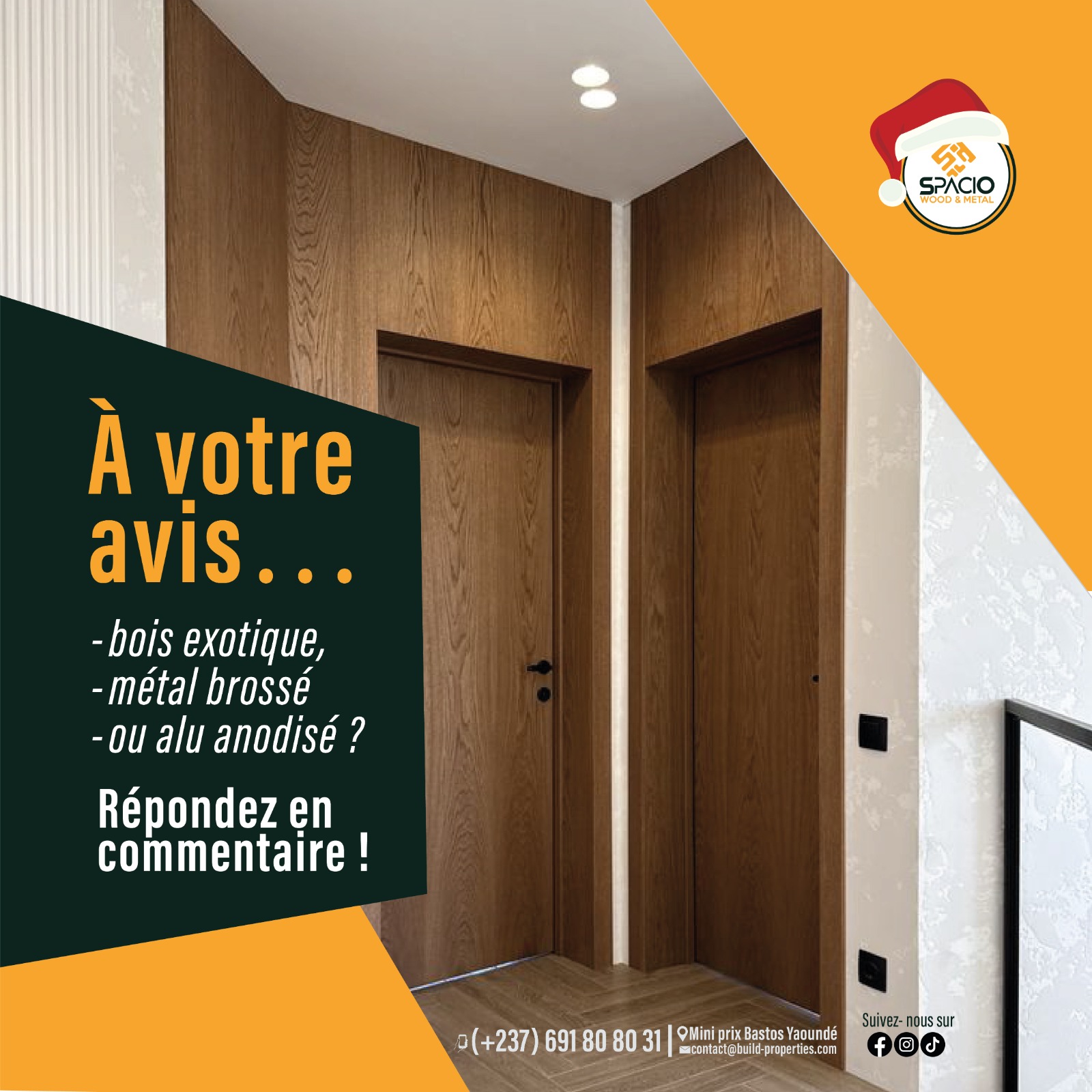 Situé à Mini Prix Bastos à Yaoundé, Spacio Wood & Metal est une entreprise de menuiserie moderne spécialisée dans la conception et la réalisation d’ouvrages en bois et aluminium. Nous fabriquons et installons des portes, des cuisines, des dressings, ainsi que des solutions d’ameublement sur mesure.