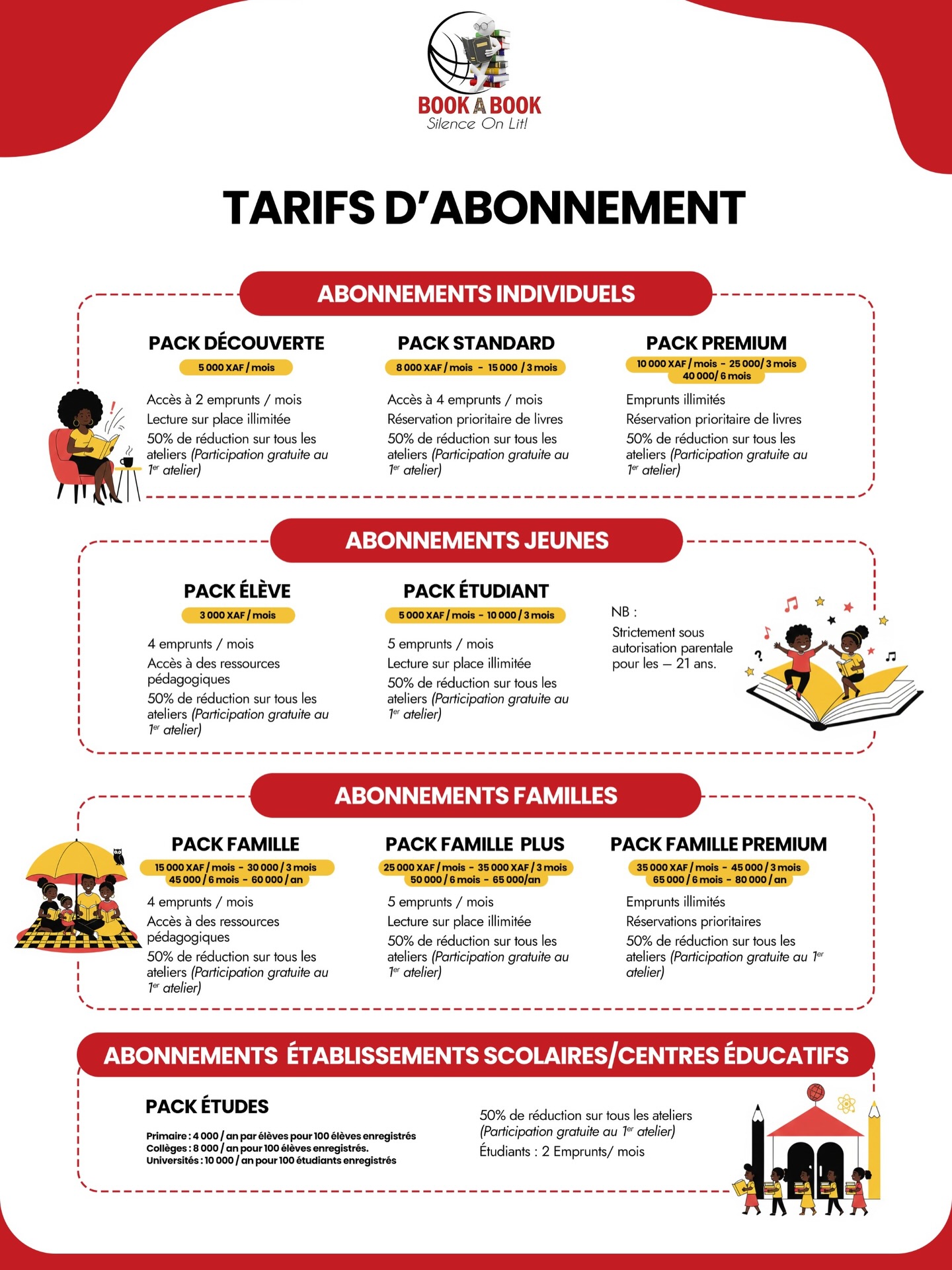 Située à biyem-assi à Yaoundé, BOOK A BOOK est une bibliothèque ouverte de lundi à samedi de 9h à 18h, qui se consacre à la promotion de la lecture et de l'éducation. Cette association a pour objectif de créer des bibliothèques et médiathèques associatives accessibles à tous, offrant un espace chaleureux et convivial pour lecteurs de tous âges.