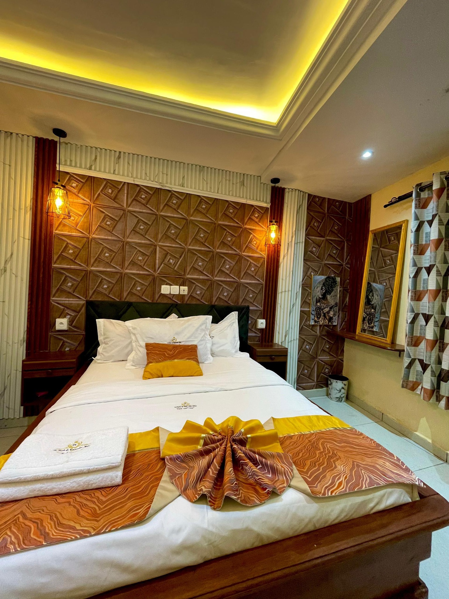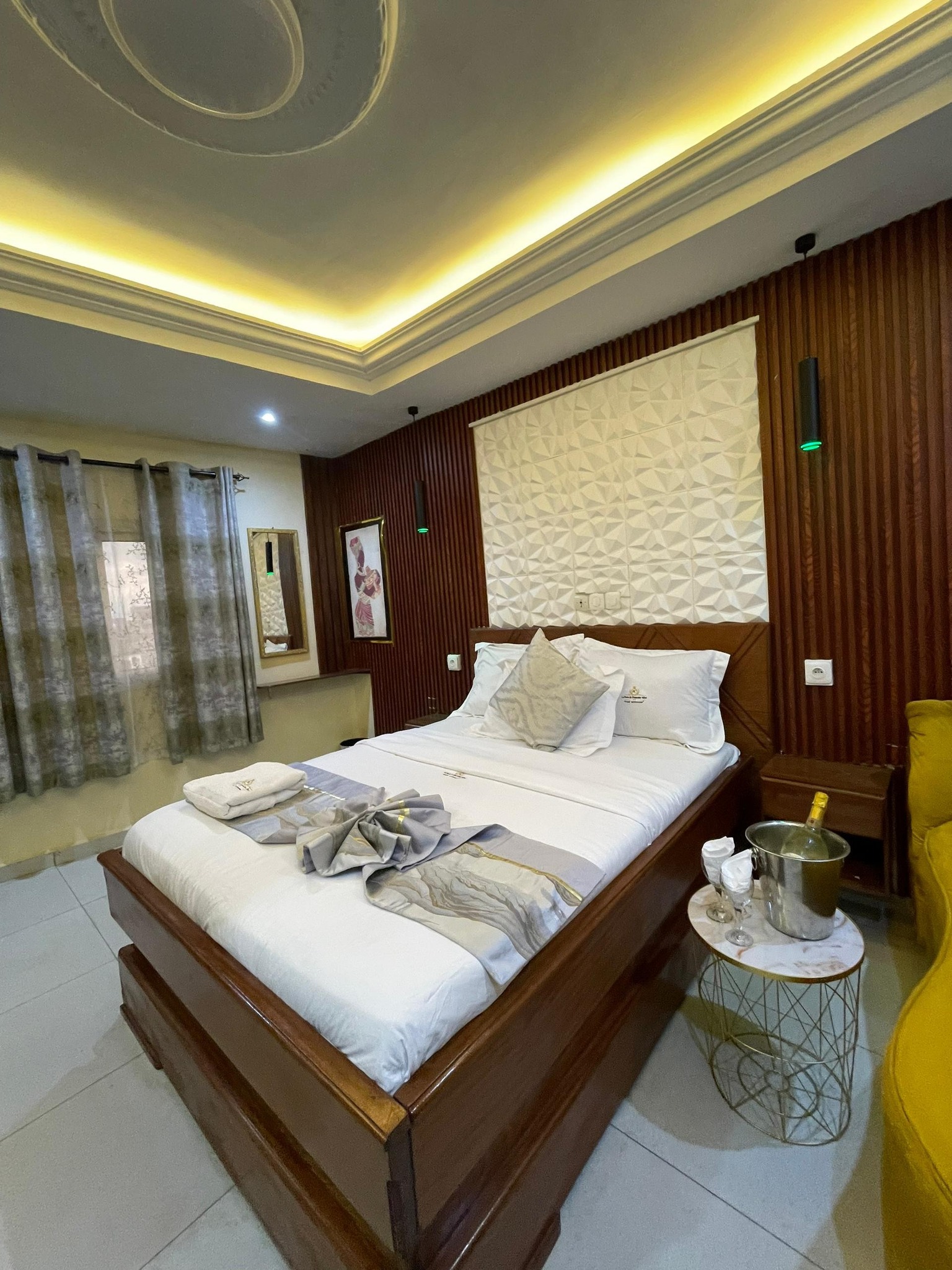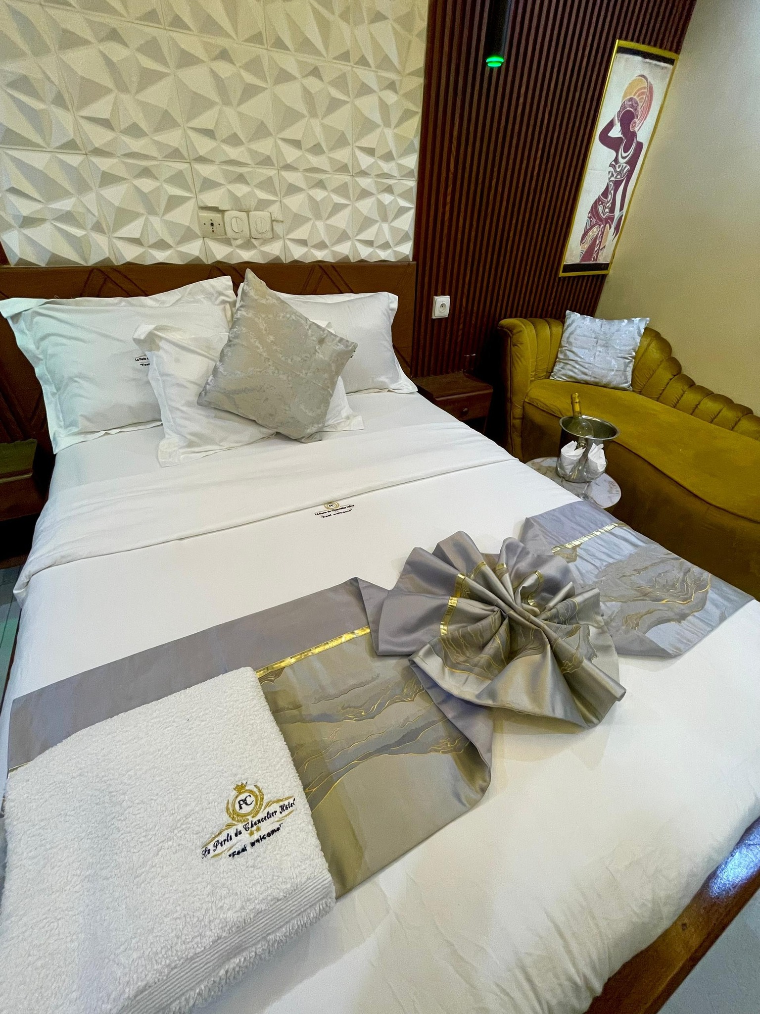 Les chambres sont conçues pour accueillir un maximum de deux adultes et sont équipées pour garantir un confort optimal. Parmi les aménagements figurent une télévision à écran 32 pouces, un lit queen size, un mini-bar, ainsi qu'un bureau de travail. Un fer à repasser est disponible sur demande, et l'hôtel bénéficie également d'un groupe électrogène et d'un forage pour assurer un fonctionnement continu.