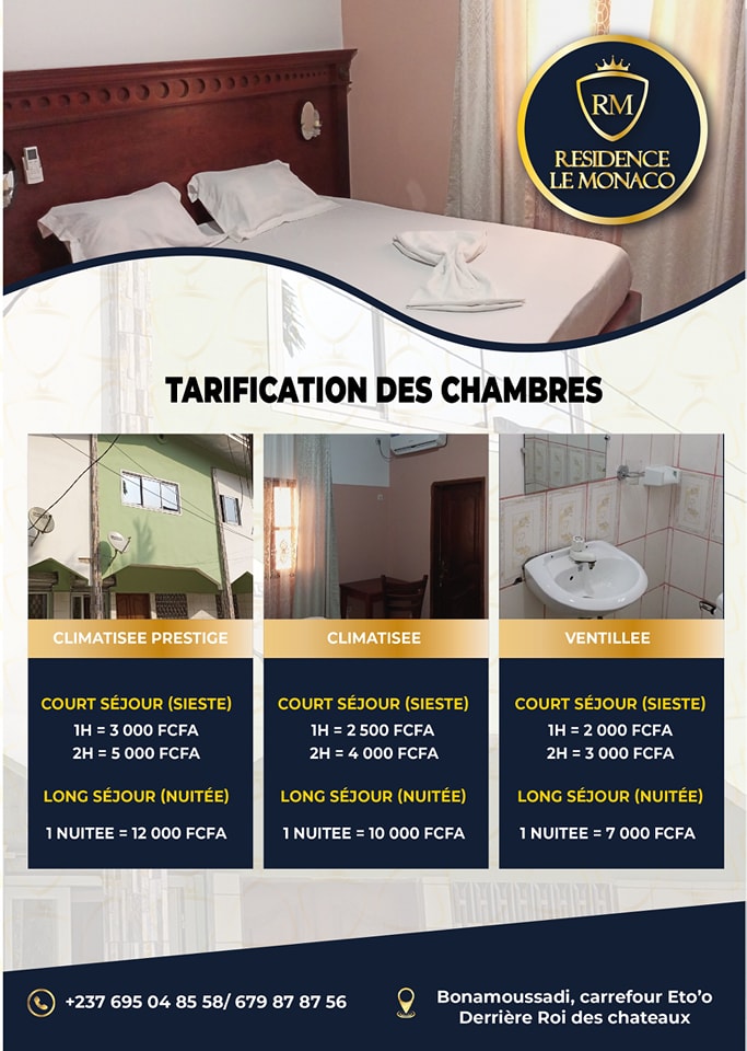 Située à Bonamoussadi à Douala, Résidence Le Monaco est un établissement d'hébergement qui propose des chambres meublées pour des séjours courts et moyens. Ce choix d'hébergement s'adresse à une clientèle variée, allant des voyageurs d'affaires aux familles en visite, en passant par les groupes d'amis.
