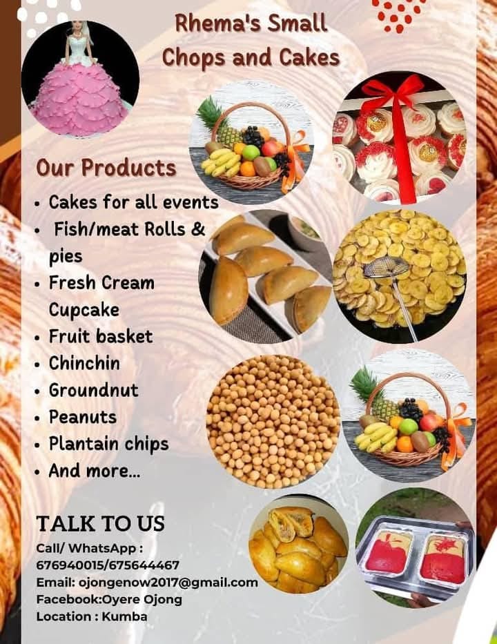 Située à Kumba, Rhema's Small Chops and Cakes est une pâtisserie en ligne réputée pour ses créations savoureuses et sa qualité exceptionnelle. Cette boutique se spécialise dans une variété de délices qui ravissent les gourmands locaux. Les clients peuvent passer leurs commandes facilement en ligne via WhatsApp, ce qui rend l'expérience d'achat pratique et accessible. Pour ceux qui préfèrent rester chez eux, la livraison à domicile est disponible, garantissant que les douceurs parviennent directement à leur porte. De plus, Rhema's Small Chops and Cakes offre des formations en pâtisserie, permettant à ceux qui le désirent d'apprendre les techniques nécessaires pour réaliser de délicieuses créations.