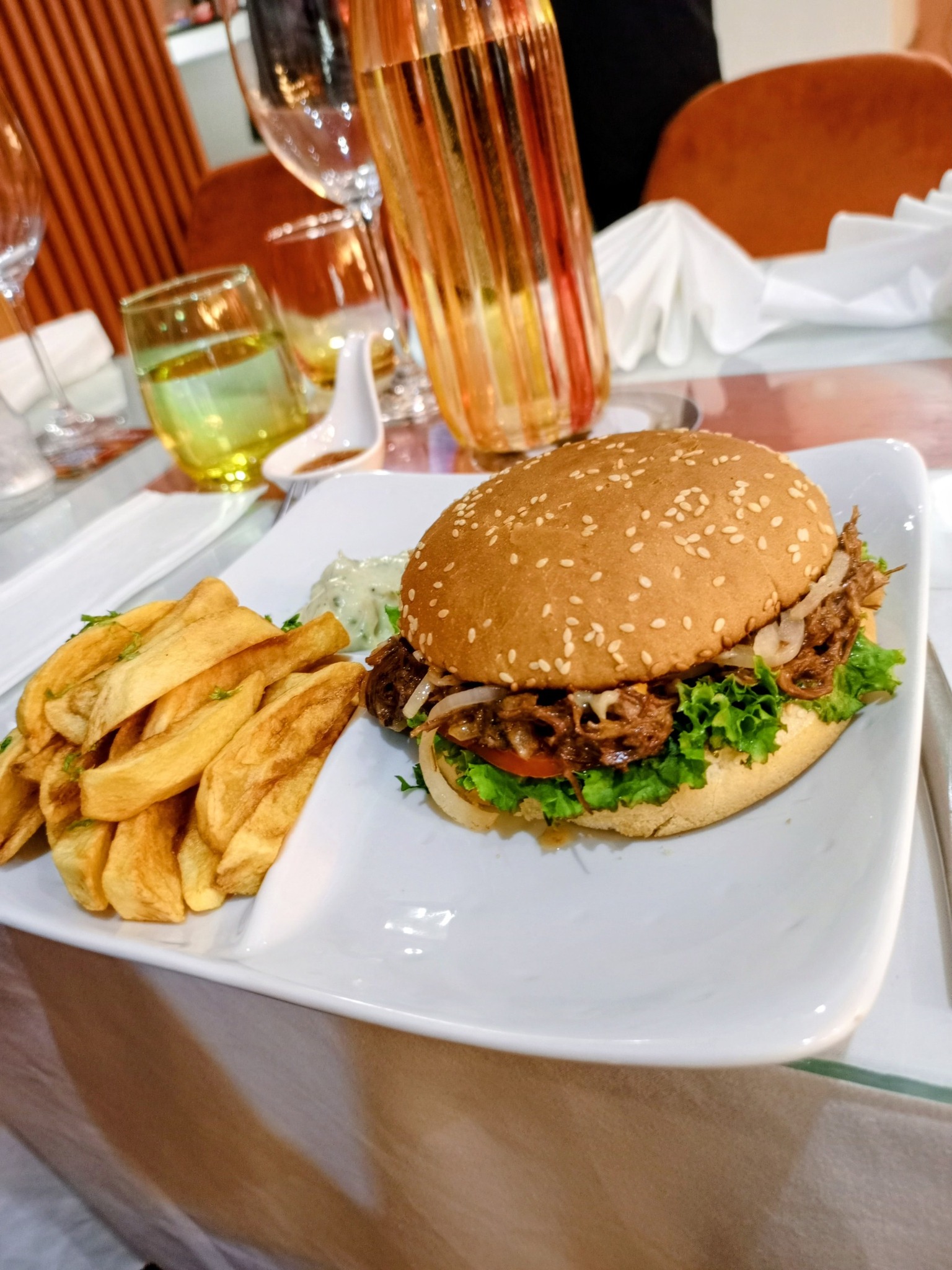 Le menu comprend une sélection tentante de plats tels que des burgers, du poulet braisé, des saucisses grillées, du ndolè, des pastels, et de la sauce basquaise au poulet. Pour accompagner ces délices, les clients peuvent choisir parmi une variété de boissons, incluant des vins, des cocktails, des jus naturels, de l'eau minérale, des bières locales et des jus gazeux, garantissant une expérience culinaire complète et savoureuse.