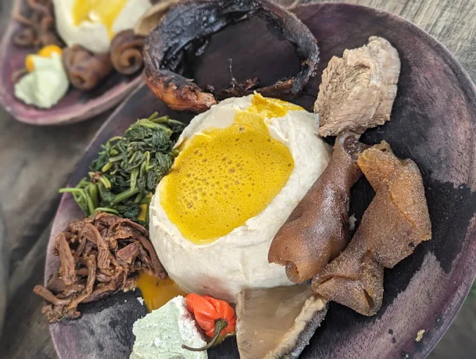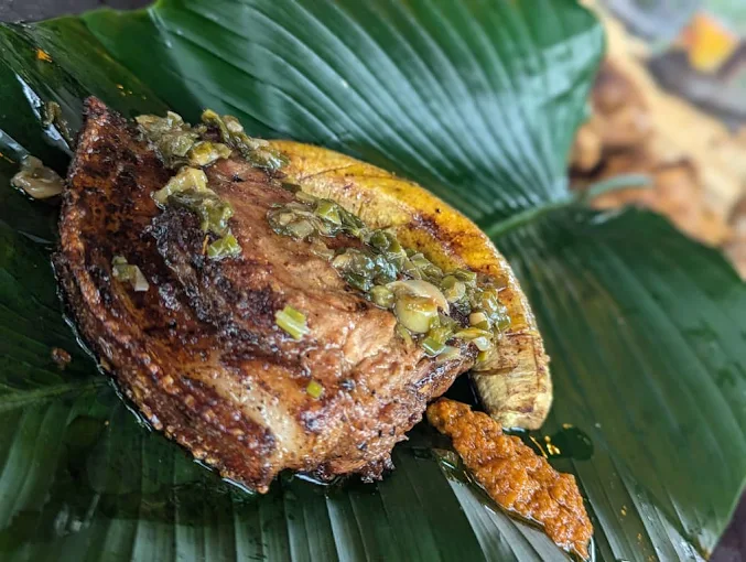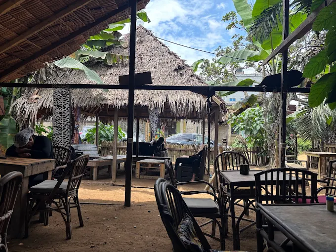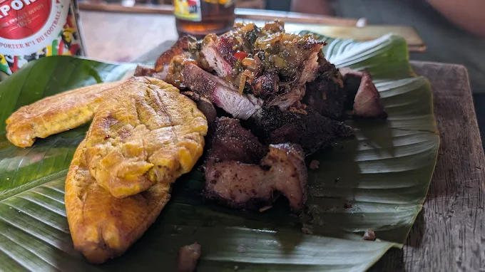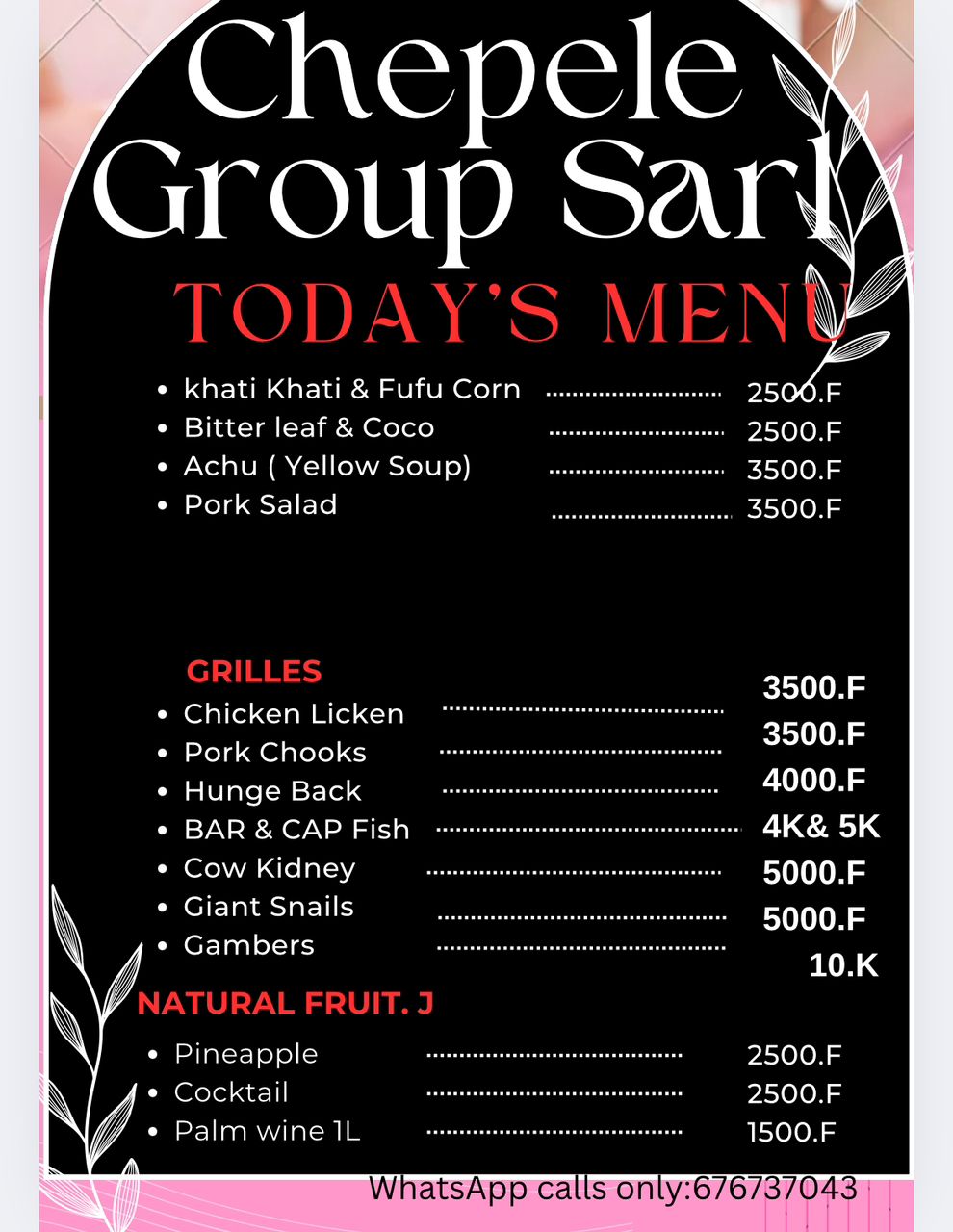 Au menu, les clients peuvent savourer des spécialités traditionnelles telles que la Pork Salad, qui est leur plat signature, ainsi que l'Achu, le Kati Kati, et des grillades de chèvre et d'escargots. Pour accompagner ces mets savoureux, le restaurant propose également des boissons originales comme le vin de palme et des rafraîchissements servis dans des tasses en bambou ou des cornes, ajoutant à l’authenticité du lieu. L'ambiance au Chepélé est très animée grâce à la musique live, aux cercles de tambours et aux danses traditionnelles qui font vibrer l’endroit. De plus, un "Sports Village Bar" est disponible pour ceux qui souhaitent suivre les matchs en direct.